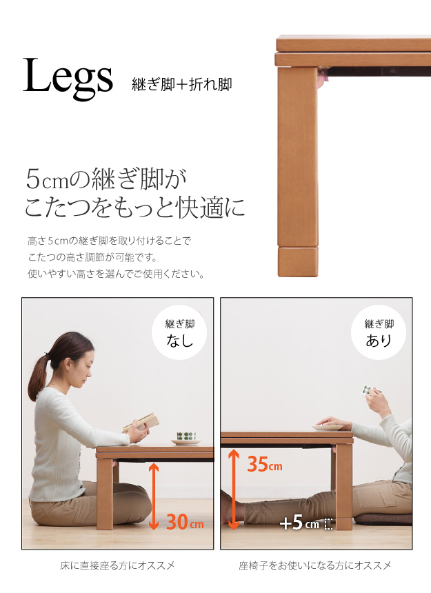 ●サイズ:こたつ-幅105x奥行75x高さ40cm(35+継ぎ脚5cm)・約21kg、布団-215x185cm・中綿量約860g