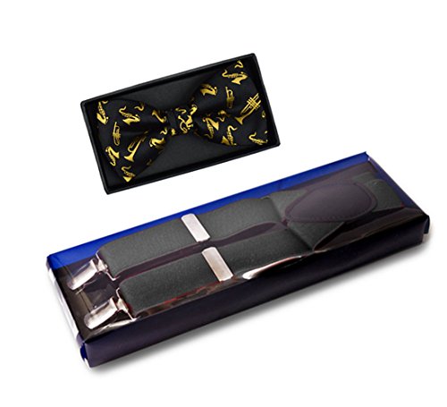 Product Description Set contains one black brass instruments banded bow tie and a pair of black suspenders for men. The clip suspenders offer a classic, professional alternative to a basic belt. 0