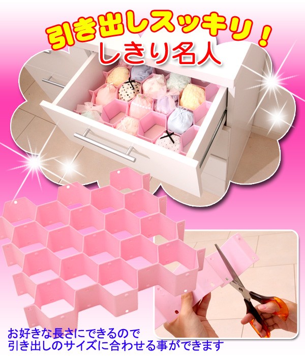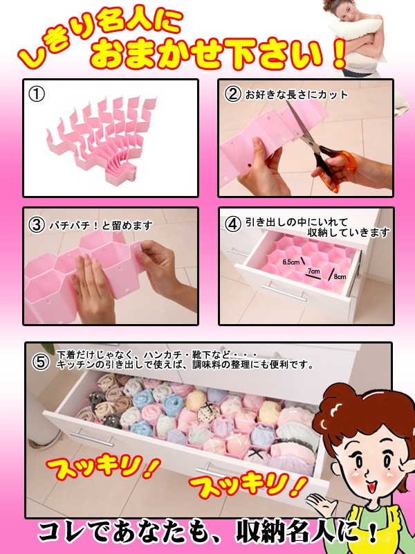 あれれ~ソックスの片方がない!お気に入りの下着が見つからない!「探してるあいだに引き出しの中がぐちゃぐちゃになってしまって・・・」そんなあなたに!スッキリ収納できる「しきり名人」をご紹介。