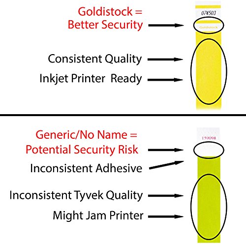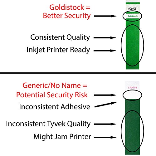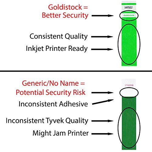 -. Feature : GOLDISTOCK SELECT SERIES - Goldistock Wristbands are reliable and consistent. Why risk the security and success of your event with Generic/No-Name Wristbands that have inconsistent quality? / TRUSTED SUPPLIER - Event organizers trust the Goldistock brand. Our wristbands have been used in over 100,000 events all across the USA and the world. We stand behind our wristbands with a 100% satisfaction guarantee. All material for our wristbands are made in the USA. All manufacturing is in the USA. / THE "BETTER SECURITY" WRISTBAND - (SEE IMAGE #2) The "Goldistock" name P.R.Inted on the wristband helps protect you from gatecrashers. / INKJET P.R.INTER READY - Goldistock Wristbands are inkjet P.R.Inter ready. We do NOT recommend P.R.Inting with a laser P.R.Inter. There are 10 wristbands per sheet. You get 20 sheets for a total of 200 wristbands. IMPORTANT- For more detailed information on how to P.R.Int on Goldistock wristbands SCROLL TO THE PRODUCT DESCRIPTION SECTION. / IDEAL FOR ANY EVENT - Concerts, sporting events, parties, fairs, water & amusement parks, trade shows, conferences, school functions, seminars, nightclubs, or any kind of event. For more detailed information SCROLL TO THE PRODUCT DESCRIPTION SECTION.