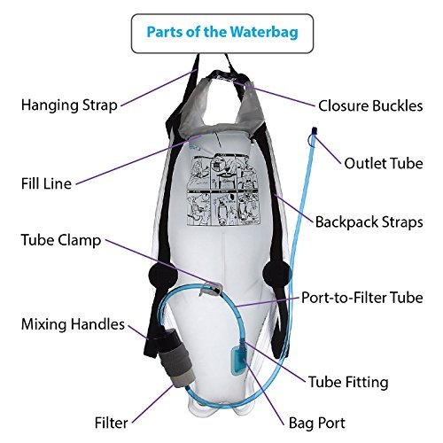 -. Feature : 2.5-gallon/10-liter family-sized water purification unit and integrated filter / Multi-treatment process includes chemical flocculent/disinfection and pump-free filtration / Treatment time is 30 minutes / Sturdy backpack straps for portability and handle strap for easy filling and hanging