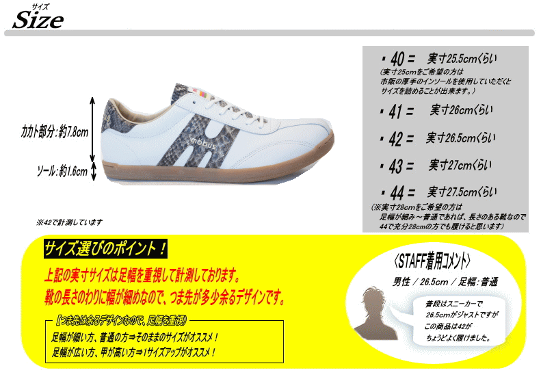 | サイズ | 作り⇒幅細め 【サイズ選びのポイント!】 足幅が細い方、普通の方⇒そのままのサイズがオススメ! 足幅が広い方、甲が高い方⇒1サイズアップがオススメ! |