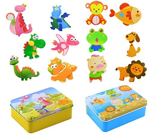 High Quality Toy Set - Decent size pieces made of wood, so they can't be destroyed or bent easily. - All the completed puzzles can be replaced into the box and the box comes with a lid.Easy to store them and very portable. - Irregular shaped pieces, which is the upper limit of 2 year old can manage, which is great for having something to stretch them.