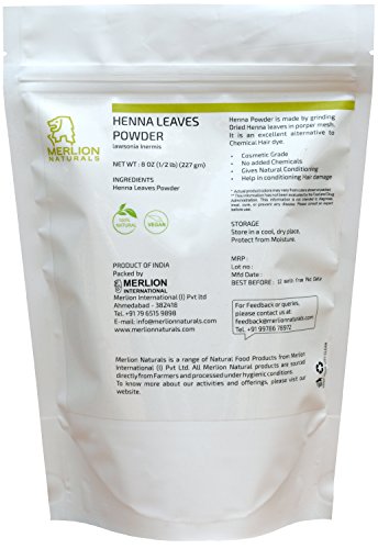 Studio : Merlion International (I) Pvt. Ltd. Publisher : Merlion International (I) Pvt. Ltd. Binding : Health and Beauty Product Description Botanical Name : Lawsonia Inermis Merlion Natural's Henna powder is excellent for dyeing hair. It gives rich reddish tone to hair and can be used with Indigo Powder for brown to black shades. At Merlion Natural's we ensure that only fresh batches of products are packed. 0