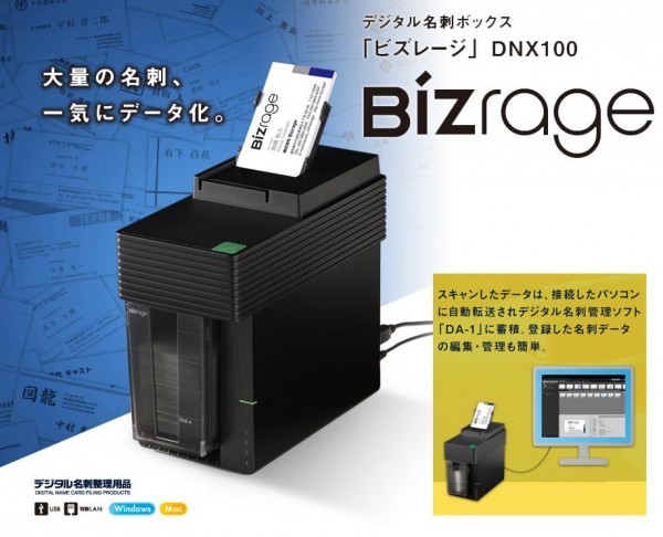 名刺をセットするだけでいい。「ビズレージ」ならボタンひとつで、スキャンから保存まで。 |