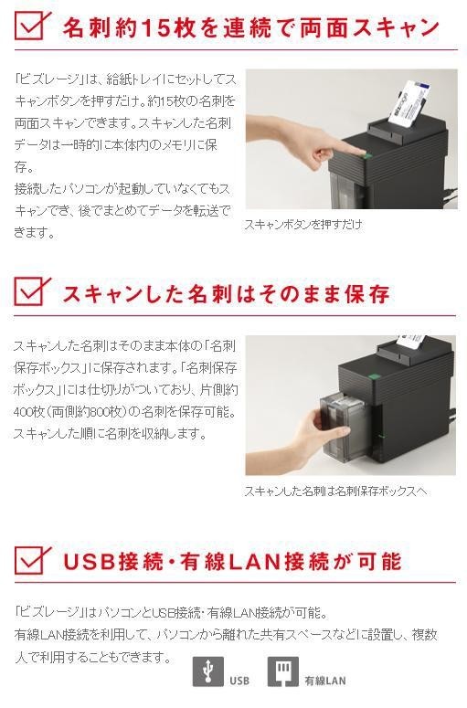 | 名刺をセットするだけでいい。「ビズレージ」ならボタンひとつで、スキャンから保存まで。 |