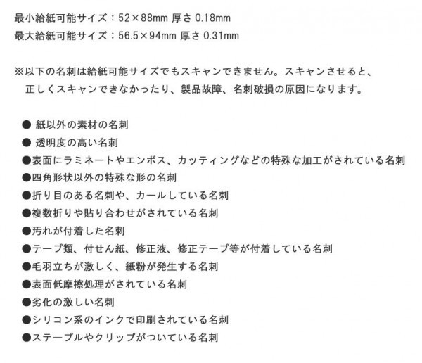 | 仕様 | インターフェイス:USB2.0(Bタイプ)、有線LAN(10BASE-T/100BASE-TX) 電源:ACアダプタ(AS1225J) 動作環境:温度5~35度 湿度30~80%(非結露) 保存環境:温度-10~55度、湿度5~80%(非結露) 読取方式:自動給紙方式、両面同時読取、カラー センサー:カラー CCDイメージセンサー 解像度:約600dpi相当(固定) 読取速度:3秒以内/枚 セット可能枚数:約15枚※お使いの名刺や本製品の使用条件によって変化します。 収納枚数:約800枚(名刺保存ボックス片側につき400枚)※お使いの名刺や本製品の使用条件によって変化します。 本体メモリ保存可能枚数:約400枚※お使いの名刺や本製品の使用条件によって変化します。 添付ソフト:DA-1、DNX100 専用ドライバ |