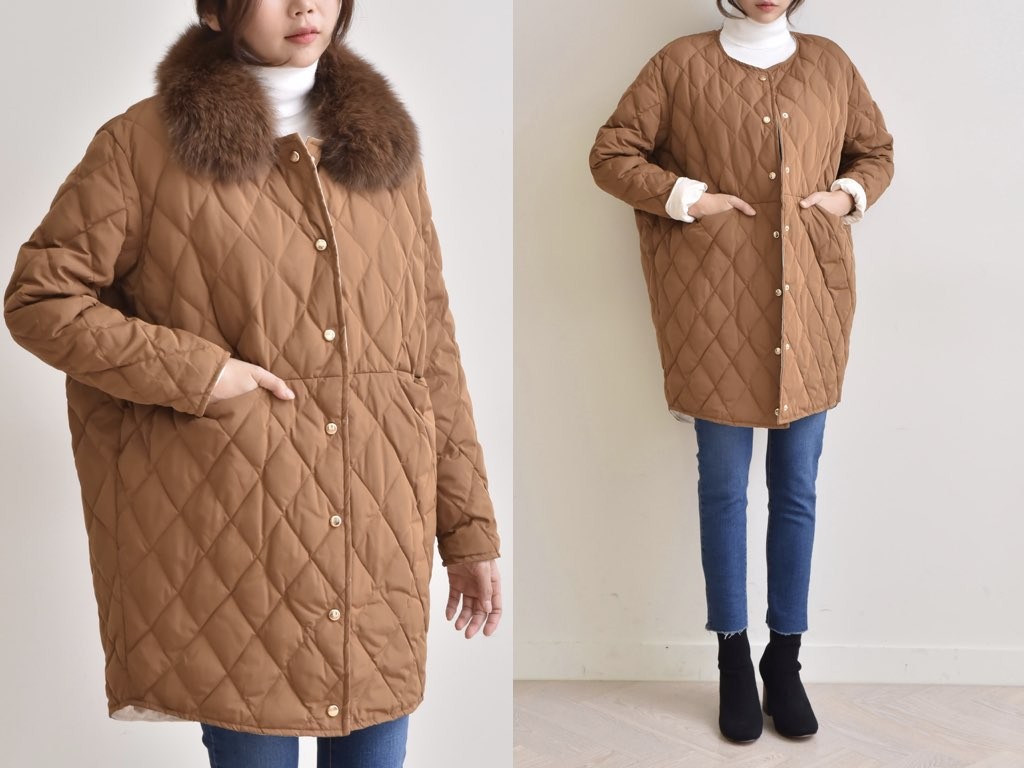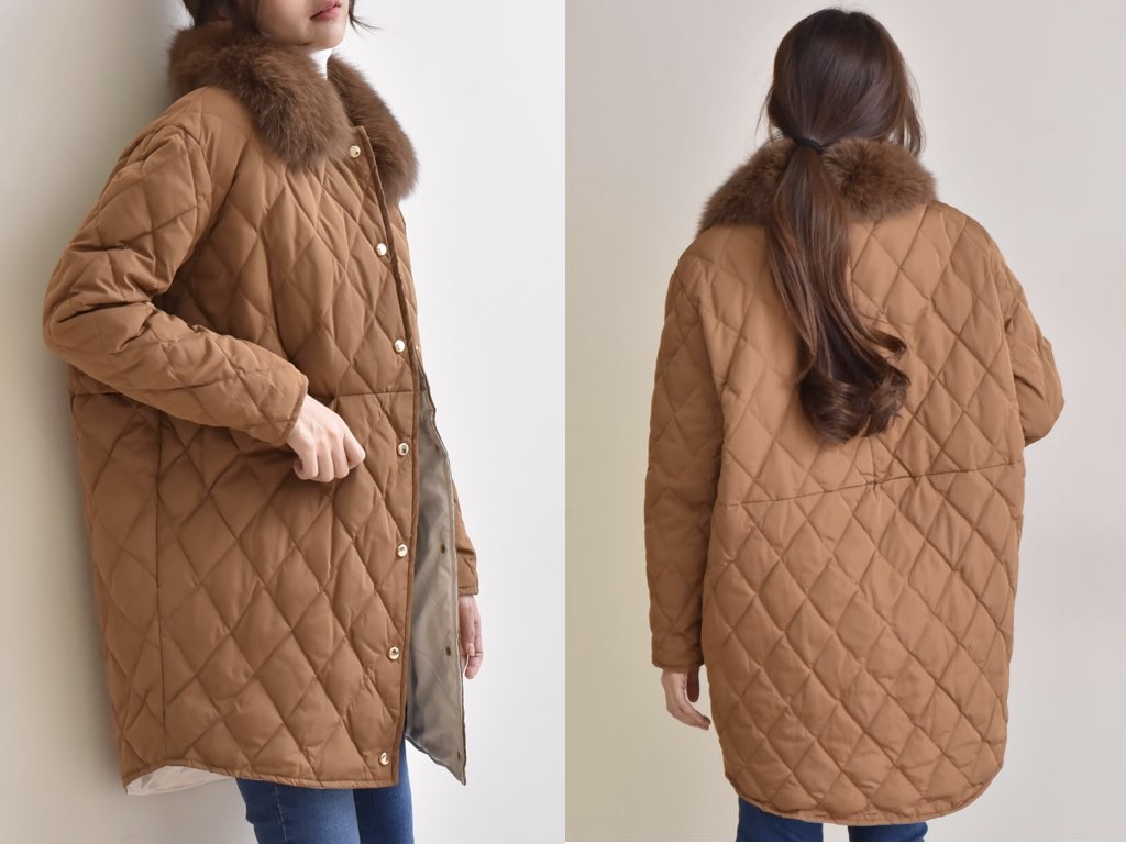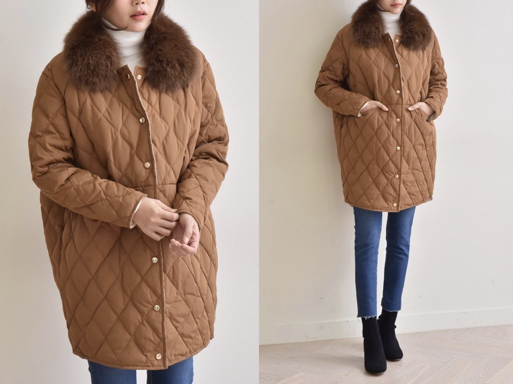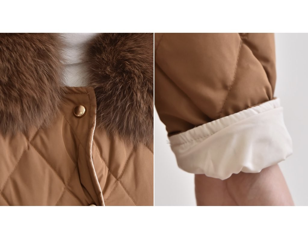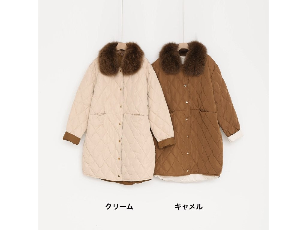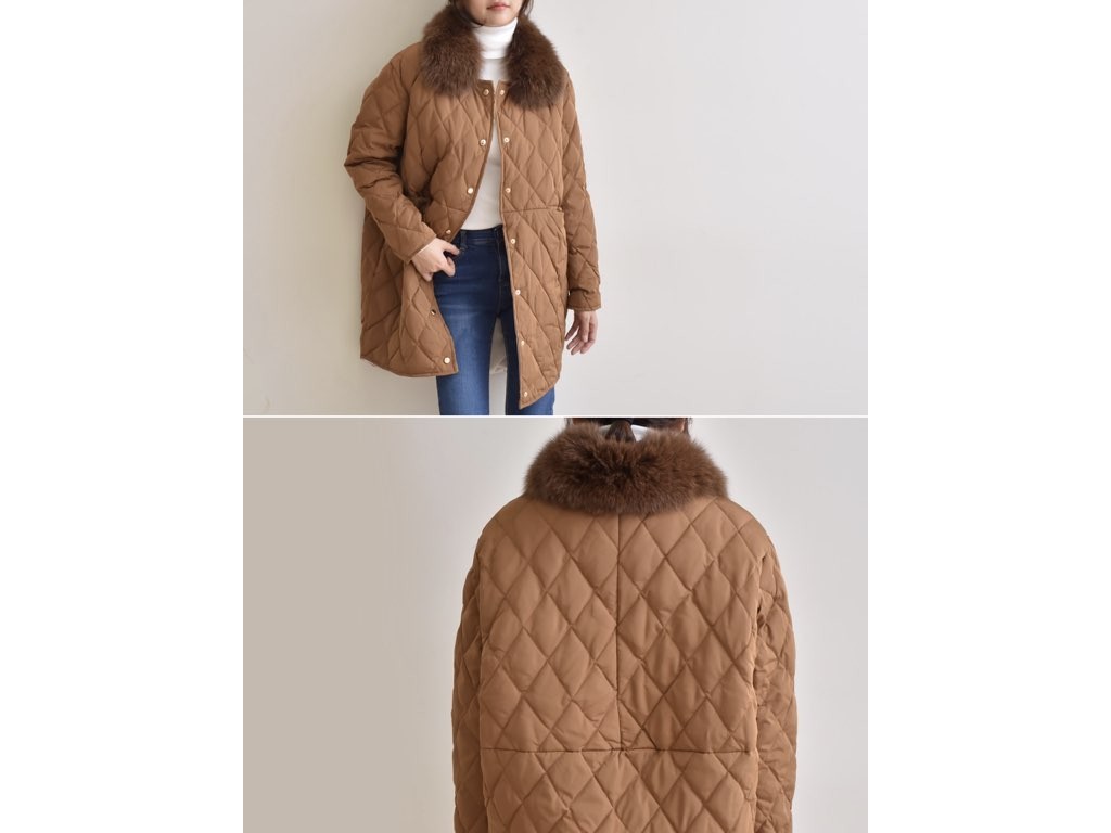 ファー キルティング ダウンジャケットです。「キルトコート」は、ダウンジャケットよりも手軽に羽織れおしゃれなイメージですね。すっきりシルエットのボトムスを選ぶと、オシャレなコーディネートできますね。1.基本情報色:2色展開(クリーム/キャメル)サイズ:Free素材:-製造国:Korea2.サイズ情報肩幅:50cm身幅(胸断面):60cm腕の長さ:56cm着丈(前):84cm着丈(後):90cm(サイズは計る方法に応じて±2〜3cmの誤差があります。ご了承お願い致します)モデル着用サイズ:F※着用モデル(163cm、体重47kg、足のサイズ24.5cm)3.その他の情報厚み:中間透け感:なし伸縮性:なし裏地:あり洗濯方法:ドライ(クリーニング)[注意事項]お取り寄せ商品は、海外より仕入れるため納品まで約10日前後いただきます。また店舗でも販売しており、在庫切れになる場合もございます。ご了承お願い致します。
