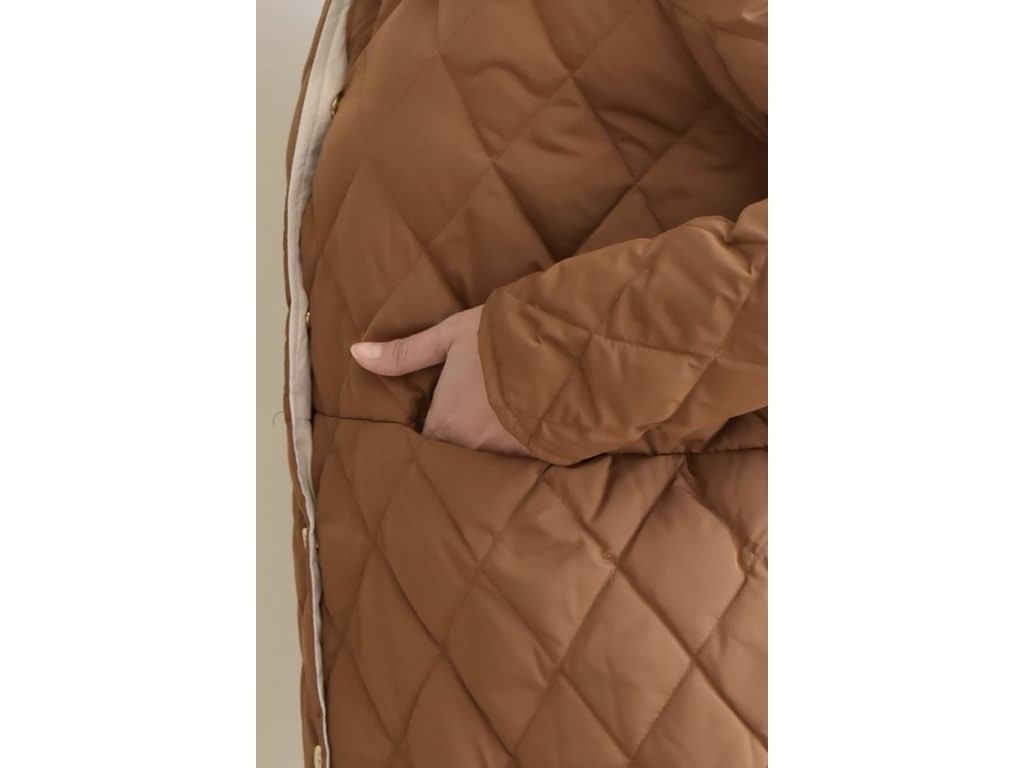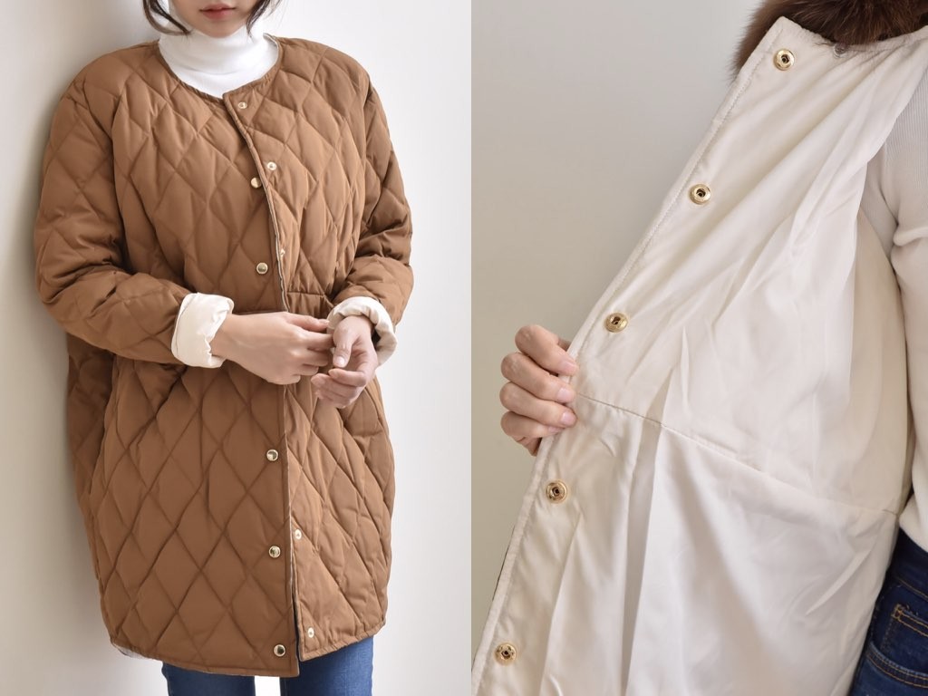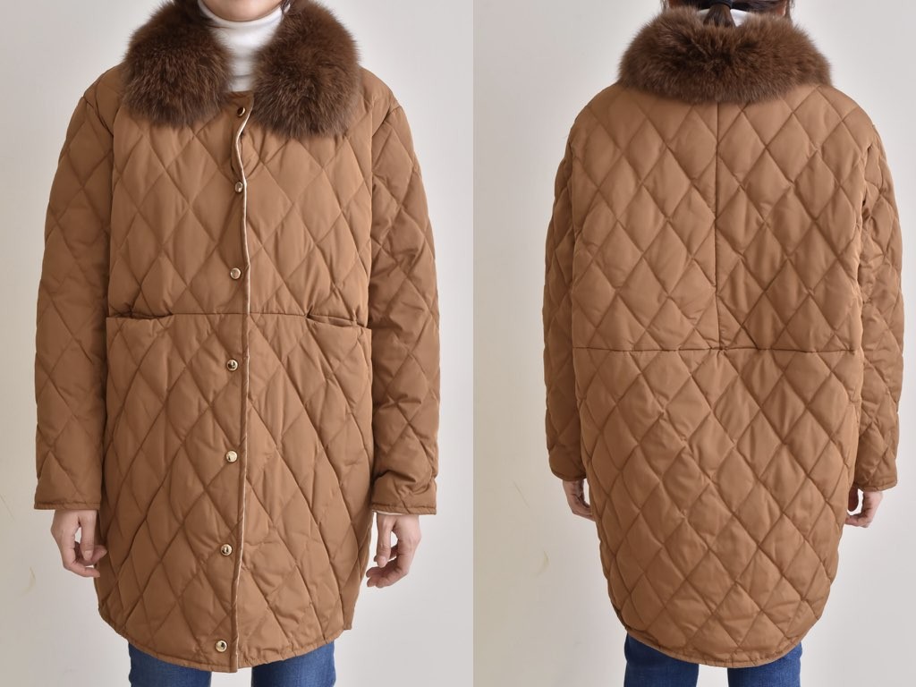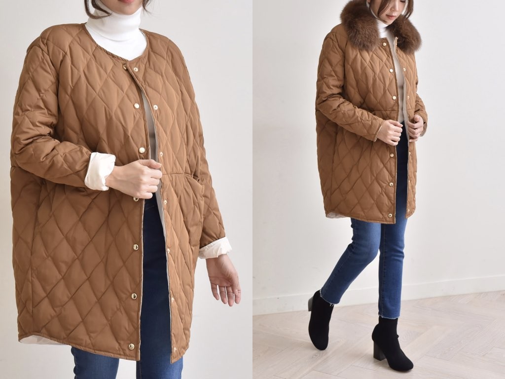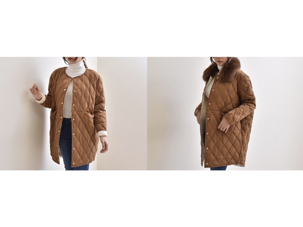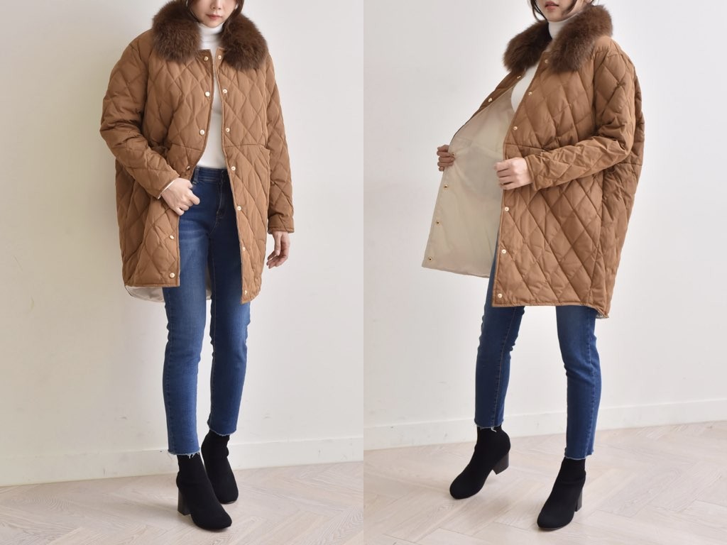 ファー キルティング ダウンジャケットです。「キルトコート」は、ダウンジャケットよりも手軽に羽織れおしゃれなイメージですね。すっきりシルエットのボトムスを選ぶと、オシャレなコーディネートできますね。1.基本情報色:2色展開(クリーム/キャメル)サイズ:Free素材:-製造国:Korea2.サイズ情報肩幅:50cm身幅(胸断面):60cm腕の長さ:56cm着丈(前):84cm着丈(後):90cm(サイズは計る方法に応じて±2〜3cmの誤差があります。ご了承お願い致します)モデル着用サイズ:F※着用モデル(163cm、体重47kg、足のサイズ24.5cm)3.その他の情報厚み:中間透け感:なし伸縮性:なし裏地:あり洗濯方法:ドライ(クリーニング)[注意事項]お取り寄せ商品は、海外より仕入れるため納品まで約10日前後いただきます。また店舗でも販売しており、在庫切れになる場合もございます。ご了承お願い致します。