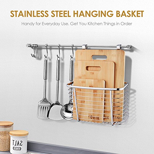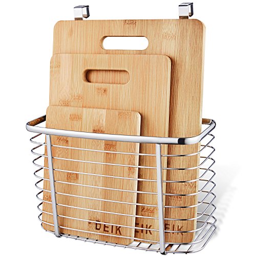 - With a Great Kitchen Organizer-Wire Basket: The storage basket is made of stainless steel. Stalled as being over-the-cabinet, inside cabinet door-mounted or wall-mounted. Used for both cutting board, muffin pan, cookie sheet and plastic food wrap and more