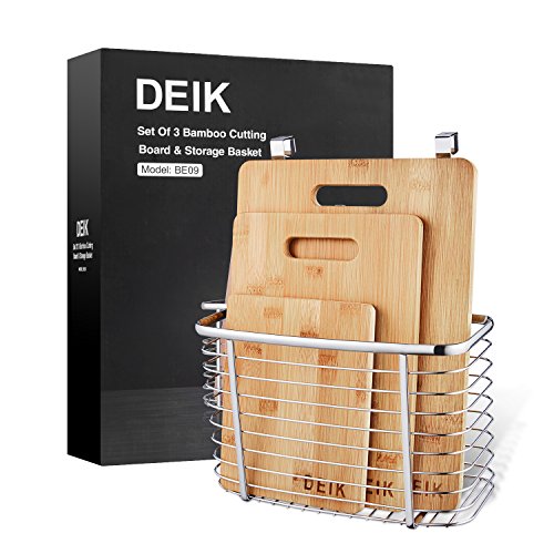 Deik Cutting Board, Totally Organic Bamboo Cutting Board, Anti-bacteria Chopping Board Set of 3, with A Stainless Steel Storage Wire Basket Holder