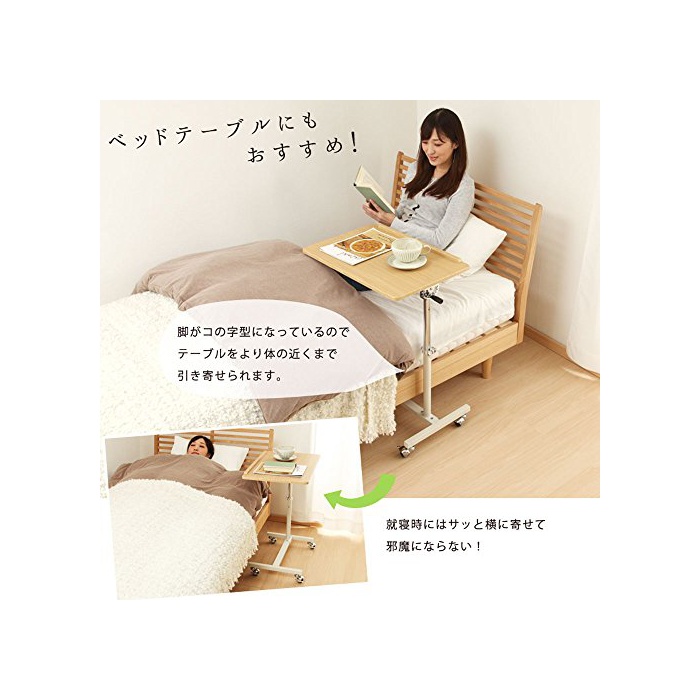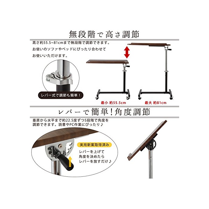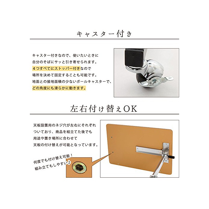 높이와 각도를 자유롭게 바뀌는 캐스터 부착 싸이드 테이블.1개 다리 (이므로)그래서 거추장스럽게 되기 어렵고, 베드 등에서도 활약합니다.수평로 하면 마실 것도 둘 수 있고, 각도를 붙이면 독서나 PC작업으로도 딱!캐스터 첨부이므로 이동도 편안히 할 수 있습니다.각도는 수직으로 수평까지 5단계,높이는 약55.5~81cm에 무단계에서 조절로 옵니다.
