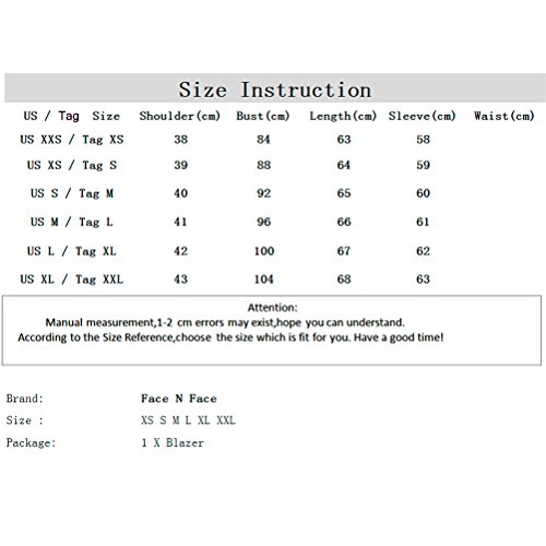 Studio : Face N Face Publisher : Face N Face Binding : Apparel Product Description Gender:Women Item Type:Women Jacket Pattern Type:Solid Material:Cotton Blended Condition:New With Tags Size:XS,S, M, L,XL,XXL Occasion:Party,Causal Daily, Date Notice: The color displayed in photos may be showing slightly different on your computer monitor since monitors are not calibrated same. Please kindly think twice about the Color Style, and confirm your Size before you buy the item Note: Above size chart are for reference only,1%-2% error. 0