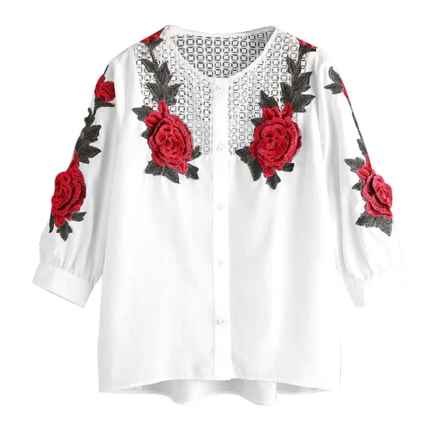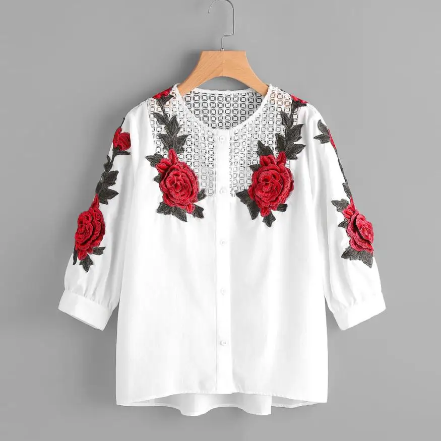 femininas ropa camisetas:Rose Floral Embroidery Blouse