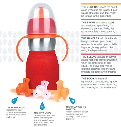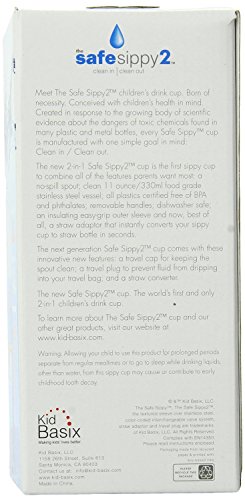 Studio : Kid Basix Publisher : Kid Basix Binding : Baby Product Product Description The Safe Sippy 2 toddler cup is the world's first and only 2 in 1 sippy to straw bottle. Made from clean, non leaching, stainless steel. The cup is tested free of BPA, phthalates and other harmful chemicals. The Safe Sippy2 combines all the great features of the original Safe Sippy, plus three new features that parents asked for most: a no spill valve straw and straw adaptor, a travel cap to keep the spout clean, and a travel plug to protect from any drips while out and about. The Safe Sippy 2 holds 11 ounce, has a straw shaped spout which is better for developing mouths, a colorful protective sleeve that provides insulation against cold liquids while protecting the cup from being dented and removable handles. The Safe Sippy2 is dishwasher safe.. 0
