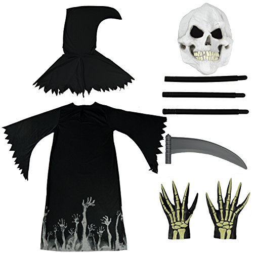 Spooktacular Creations Grim Reaper Glow in the Dark Effect Child Deluxe Costume Set. Includes Grim Reaper Hood with Attached Cape, Robe, Skeleton Mask, Vinyl Skeleton Gloves and Scythe!!! GLOWing Effect on Vinyl Skeleton Gloves and Robe.Super Value Pack for Role Play. Perfect for Halloween Dress Up Parties, Grim Reaper Themed Parties, Grim Reaper Costume, Phantom Costume, Spooky Halloween Costume, Scary Costumes for Boys, Halloween Costume Dress Up, Grim Reaper Role Playing, Activity, Everyday Play and More!