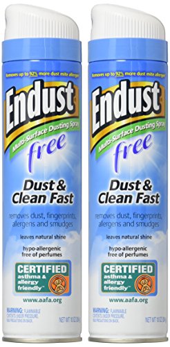 -. Binding : Health and Beauty -. Brand : Endust -. Color : Hypo-Allergenic Fragrance Free -. EAN : 0886449507528 -. Feature : Quickly pick up dust and remove allergens, fingerP.R.Ints and smudges from just about anywhere in your house / Hypo-allergenic and fragrance-free formula is designed to reduce allergens on surfaces and in the air / Certified asthma & allergy friendly(TM) by the Asthma and Allergy Foundation of America / Silicone-free formula is designed to leave a natural shine without any residue or build-up -. IsAdultProduct : 0 -. Label : Nakoma Products -. Manufacturer : Nakoma Products -. NumberOfItems : 1 -. PackageQuantity : 1 -. ProductGroup : Health and Beauty -. ProductTypeName : HEALTH_PERSONAL_CARE -. PublicationDate : 2016-09-09 -. Publisher : Nakoma Products -. ReleaseDate : 2016-09-06 -. Size : 2 Count -. Studio : Nakoma Products -. Title : Endust Fragrance Free Hypo Allergenic Dusting and Cleaning Spray, 2 Count -. UPC : 886449507528