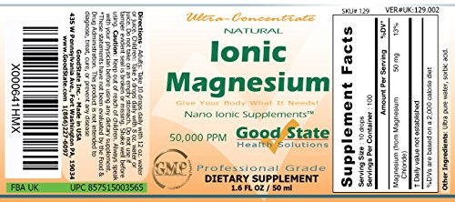 -. Binding : Health and Beauty -. Brand : Good State -. EAN : 0857515003565 -. Feature : Now also available in GLASS BOTTLE! (search "Good State Ionic Magnesium Glass Bottle")! / Absorbs Much better than Pills! / Only 10 Drops equals 50 mg of Ionic Magnesium - 100 Total Servings / Professional Grade - Natural Magnesium - Gluten-Free! / Easy to Mix with Juice or Water. Can be taken Sublingually. Comes with Dropper! Small size - Very convenient for travel -. IsAdultProduct : 0 -. Label : Good State - Liquid ionic magnesium ultra concentrate - 10 drops per 50mg - 100 servings -. Manufacturer : Good State - Liquid ionic magnesium ultra concentrate - 10 drops per 50mg - 100 servings -. Model : 129 -. MPN : 129 -. NumberOfItems : 1 -. PackageQuantity : 1 -. PartNumber : 129 -. ProductGroup : Health and Beauty -. ProductTypeName : HEALTH_PERSONAL_CARE -. PublicationDate : 2014-10-02 -. Publisher : Good State - Liquid ionic magnesium ultra concentrate - 10 drops per 50mg - 100 servings -. Studio : Good State - Liquid ionic magnesium ultra concentrate - 10 drops per 50mg - 100 servings -. Title : Good State Liquid Ionic Magnesium Ultra Concentrate (10 drops per 50 mg - 100 servings per bottle) -. UPC : 857515003565