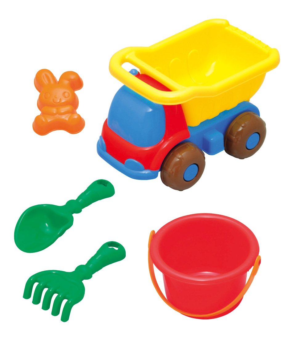- A set with a scoop, a bear, a bucket, and a sand mold attached to a dump truck with a total length of 340 mm.