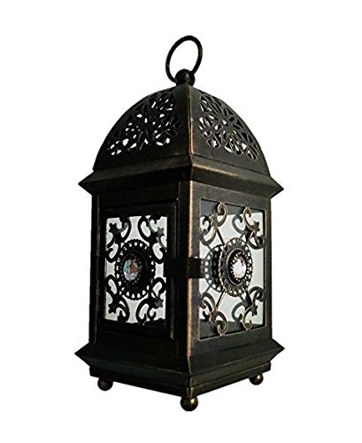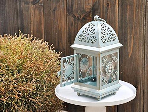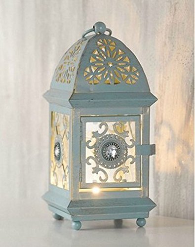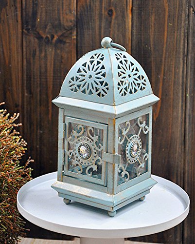 -. Feature : Structured with light blue cast iron frames, glass panels and patterned metalwork & rhinestone center embellished in a slightly worn/scratched vintage design.Item Size: 4" x 4" x 8" from foot to top. / Freely put on tabletop, mantelpiece, floor, doorstep, pedestal, lawn and etc. to bring out more artistic taste. And also may hang up with the top handle in the way that pleases you. / Sturdy but not heavy. Handmade by craftsman.Cast a charming glow when a candle lit inside which offers great atmosphere to the evenings / A brilliant addition for indoor or outdoor settings like home, room, hall, balcony, courtyard, garden, patio, porch, terrace, veranda, coffee house, cafe shop. / Suit for different sizes and shapes of candles.An ideal decor for weddings, parties, patio, events for indoors/outdoors and more.