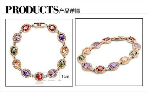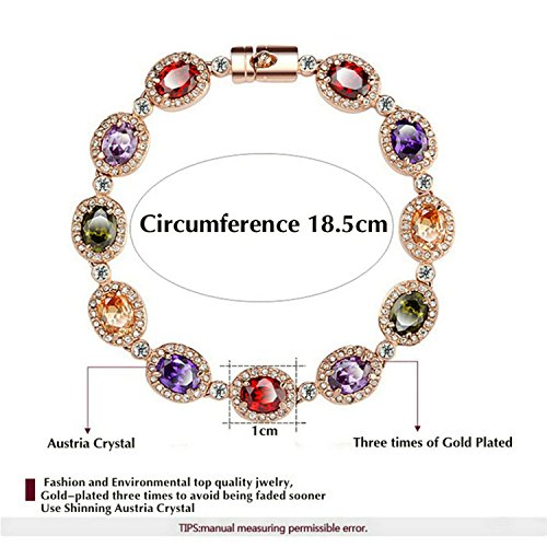 - Feature : The bracelet consists eleven colorful Austrian crystals with always shinning gloss. / Three layers of 18K rose gold plated, nickel free and tarnish free, comfort fit. / The circumference is 7.2''. It's an excellent gift for anniversaries, graduations, birthdays, or just as a surprise to remind that special someone how much you care. / Shipped out in an exquisite jewelry gift box. Delivery time 7-15 days. / One year warranty to ensure you a perfect shopping experience.