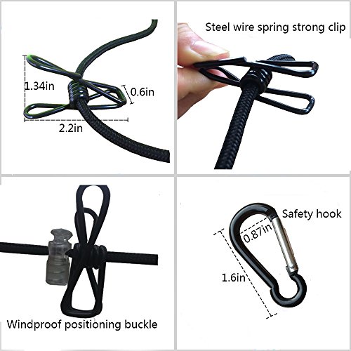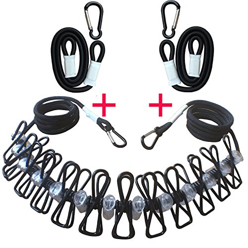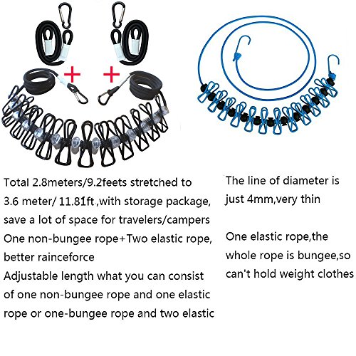 - Three-pieces clothesline:The one non elastic cord and extra two bungee cords ,12 clothespins, 13 windproof positioning clips, 4 hooks