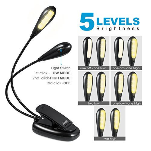 【5 LEVELS BRIGHTNESS】AMIR book light consists of 8 SMD LED bulbs, 5 brightness modes. 1 switch button behinds each head. 1st click low level, 2nd click high level, 3rd click off. Bright enough for reading at night and can easily light up 2 pages of book, notebook & anything else you'd like lit up.