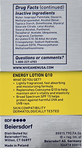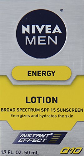 -. Binding : Health and Beauty -. Brand : Nivea Men -. EAN : 0072140014049 -. Feature : Especially developed for men. / Replenishes Coenzyme Q10 to help maintain skin's vitality and elasticity. / Broad Spectrum SPF 15 helps protect against harmful UVA and UVB rays. / Lightly fragranced, fast absorbing and moisturizing formula. / World's No. 1 Men's Skin Care Brand. Source: Euromonitor International Limited; NIVEA in the category Men's Skin Care; in retail value terms, 2013. -. IsAdultProduct : 0 -. Label : Nivea For Men -. Manufacturer : Nivea For Men -. Model : 1404 -. MPN : 72140014049 -. NumberOfItems : 1 -. PackageQuantity : 1 -. PartNumber : 72140014049 -. ProductGroup : Beauty -. ProductTypeName : BEAUTY -. PublicationDate : 2013-09-02 -. Publisher : Nivea For Men -. ReleaseDate : 2013-06-13 -. Size : 1.7 -. Studio : Nivea For Men -. Title : NIVEA MEN Energy Moisturizing Face Lotion Q10, SPF 15, 1.7 oz Bottle -. UPC : 072140014049