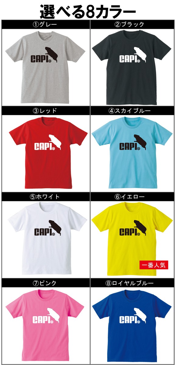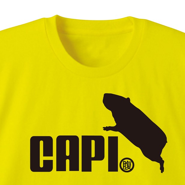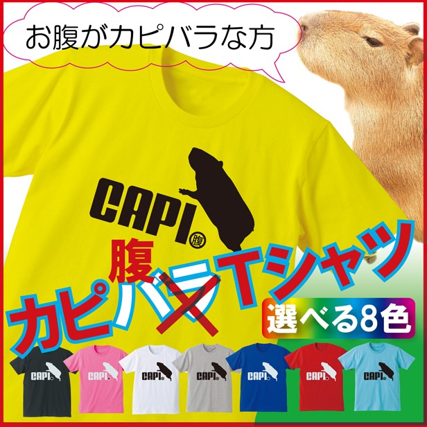 カピバラをこよなく愛する方にお届けしたいtシャツです…っていうか、お腹がメタボなカピバラさんに着て欲しいTシャツです。ローマ字で「CAPI」の後は「腹」って小さくデザインされています(笑)ようするに、カピ腹な方へのジョークTシャツです!Tシャツのカラーは8色から選べるようになりました!サイズはキッズサイズから大人用までございます!