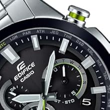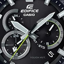 “Speed & Intelligence"をブランドコンセプトに、先進のテクノロジーとダイナミックなデザインが融合した「エディフィス」から、デュアルダイアルワールドタイム搭載の電波ソーラーモデルが登場。ベゼルやインデックス、インダイアルは太くて力強い、大胆なボールドデザインを特徴としながら、シンプルで見やすいフェイスを実現しています。また、大型のステンレスムクケースは、スポーティさと上質感を両立させています。8時側インダイアルには、24時間制表示のワールドタイムを搭載し、シンプルで視認性の高いデザインに仕上げました。ライムグリーンをアクセントカラーに採用。世界を駆け巡る男達に向けた、ダイナミックでスポーティなデザインのエディフィスの誕生です。