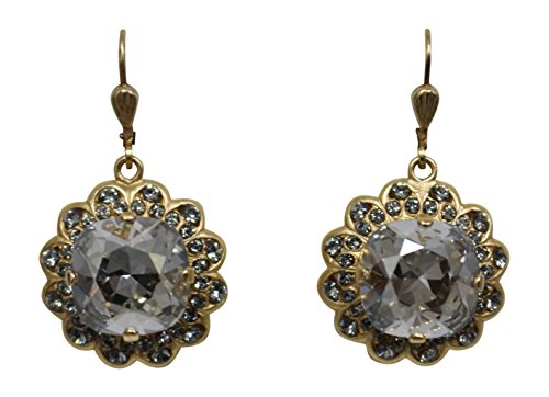 -. Feature : Antiqued Goldtone Luxe Shade & Grey Swarovski Crystal Earrings / Approximately 3/4" in diameter : one large Shade crystal surrounded by small grey crystals / Hand set Swarovski Crystals - the finest Austrian crystals available / Light weight : leverback closures : image is enlarged to show detail / Made in France