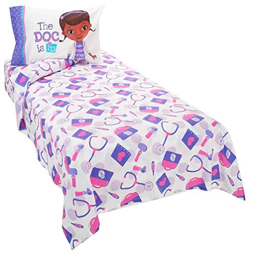 Disney Doc McStuffin twin sheet set includes 1 66 x 96 flat sheet, 1 39 x 75 fitted sheet & 1 20 x 30 Standard pillow case.