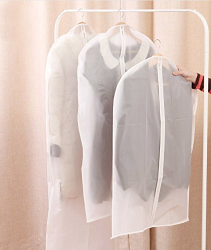 -. Feature : WASHABLE SUIT COVER: This set of 5 garment bags are made of polyester material.Water and mildew resistant, it can protect your clothing from dust and pets hair, keeping them fresh, clean and wrinkle free. / ONE PACK OF 5: This size 35.5 x 23.6 inches garment cover is in a very light weight, it's perfect for all your storage and travel needs. Ideal size for suits, shirts, trousers, tops, sport coats etc, it is bit short for sone dresses or winter coats,please kindly check the / EASY TO TRANSPORT, BUILT TO LAST: ideal length for suits, shirts, pants, tops, jumpers etc.Avoid wrinkles,Water-resistant,dust resistant and mildew-resistant. / CAN BE REUSED: This garment suit bag can be washed, so you can reuse it for a long time. Also it can be folded in a small size easily, very easy to store when you don't use them. Save lots of space. / PERFECT FOR TRAVEL: Could be washing, folding, and reused for a long time. Stop stuffing all of your suits in one suitcase or garment bag. With this 5 units in ONE set, each of your suits or dresses can have their own cover and room to breathe. This prevents suits from getting musty or crumpling together and losing their crisp, ironed look. Our garment bags also work well with a dress, gown, coat, uniform, suit, pants, tuxedo, or other pieces of clothing.