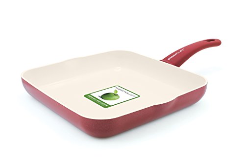 The GreenLife Healthy Non-Stick 10” Square Griddle provides an easy and clean way to cook various foods. The Thermolon prevents food from sticking and is free of PFOA, lead and cadmium, making it safe to use. The solid base ensures even heat distribution so food cooks thoroughly and properly. Soft touch handles allow for a secure and comfortable grip. These are also coated in Thermolon, making them and the griddle's cooking surface convenient to clean. With two spouts, grease and other liquids can easily be emptied out of this ceramic square griddle. It is dishwasher safe and can even be placed in the oven for baking. It is suitable for pancakes, bacon, eggs and many other dishes.Feature