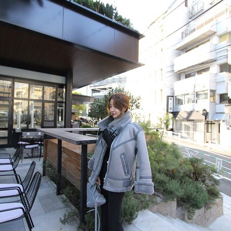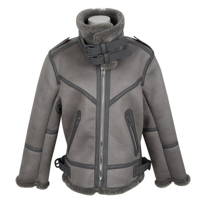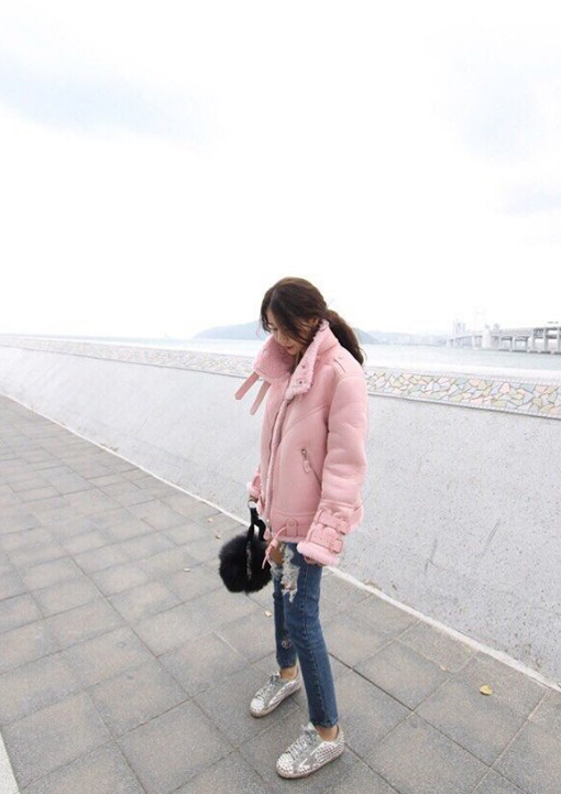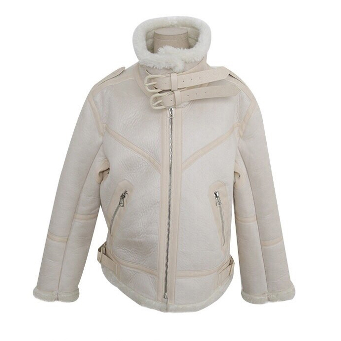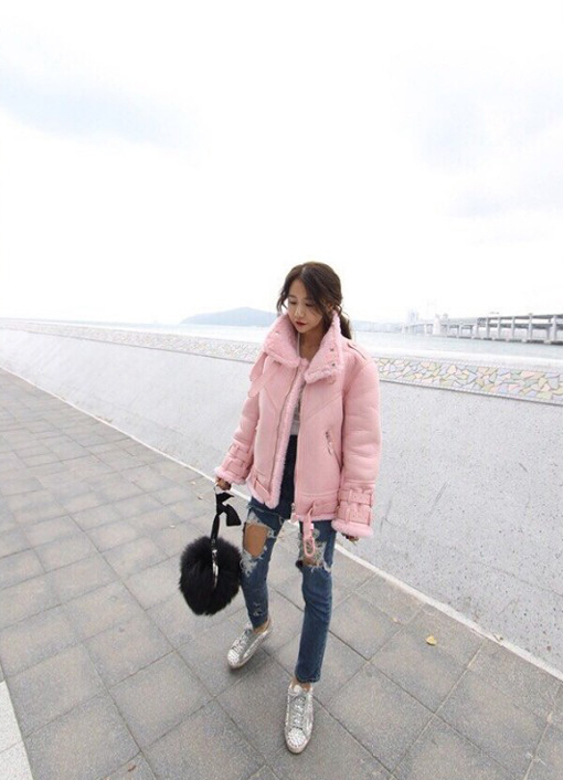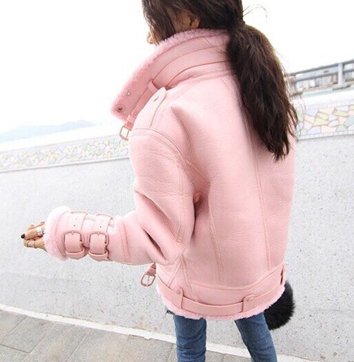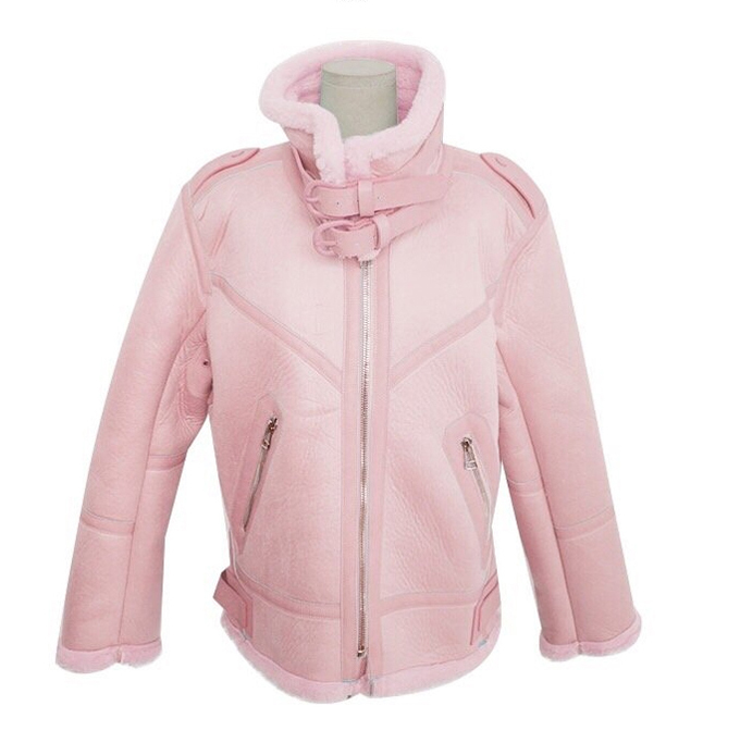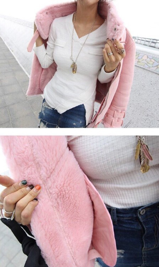 Women`s Belted Accents Shearling Jacket Gray Beige Mint Pink Black