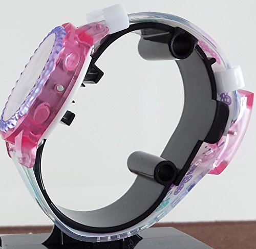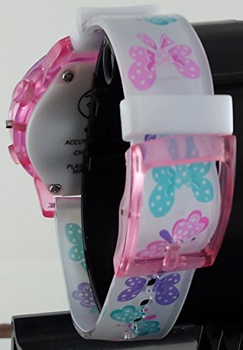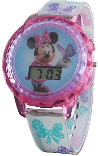 This is a cute kids Minnie watch.that lights up in red,green and yellow for 10 seconds with the push of a button.The band will adjust to your child's wrist perfectly with 8 holes and a buckle clasp. The face and band have cute graphics of butterflies.Feature