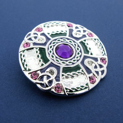 -. Title : Silver Plated Celtic Brooch with Coloured Enamel And Faceted Stones.