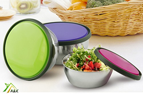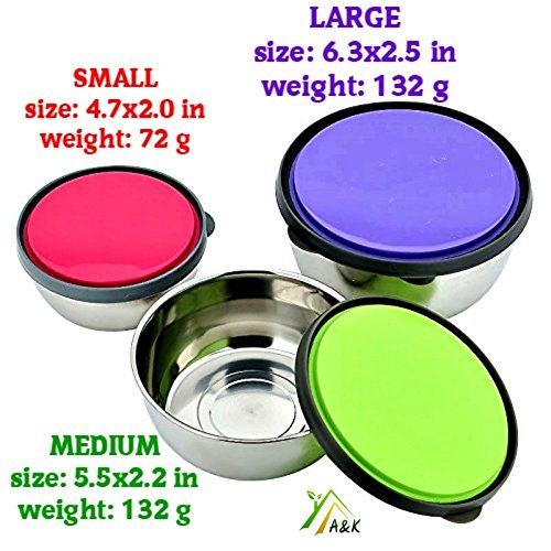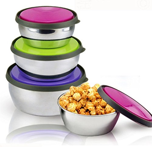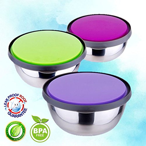 ** MULTIPURPOSE FAMILY USAGE: Cute lunch box set looks very attractive with bright silicone BPA free lids in purple green and pink colours. Steel lunch box suitable for men or women. You can pack any kind of snack, cereal or fruits in a metal bowl, close it with airtight lid and send it to school for kids lunch. Lids are easy to open and close by even toddlers so no worries that your kiddo will not be able to open it. Even your pet will love the bowl: it works well as cat or dog food container