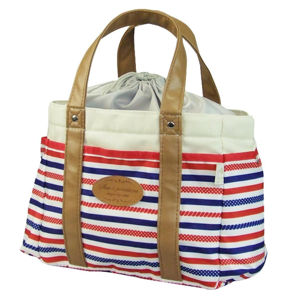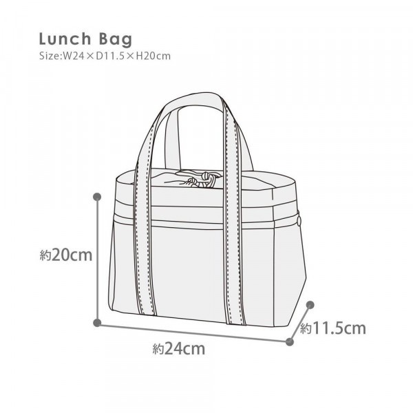 | トートバッグタイプのかわいいランチバッグ。お弁当とペットボトルもしっかり入ります。普段使いやちょっとしたお買い物にも便利。フタ部分が巾着タイプなので、中身が見えません。 |