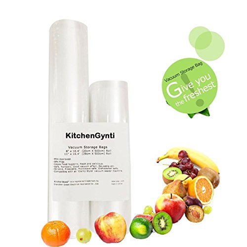 KitchenGynti Vacuum Sealer Rolls Bags for Food Storage.2 Rolls 11" x 16.4' and 8" x 16.4' .Commercial Grade Bag Rolls for FoodSaver and Sous Vide.