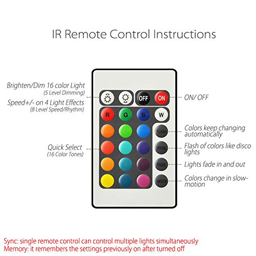 EASY REMOTE CONTROL - Use the credit-card sized wireless remote to choose 16 fixed color light (red, green, blue, pink, purple, yellow, orange, white, etc) plus 5-level high/ low brightness (bright & dim) settings and 4 fun & cool light transition effects plus rhythm/ speed control