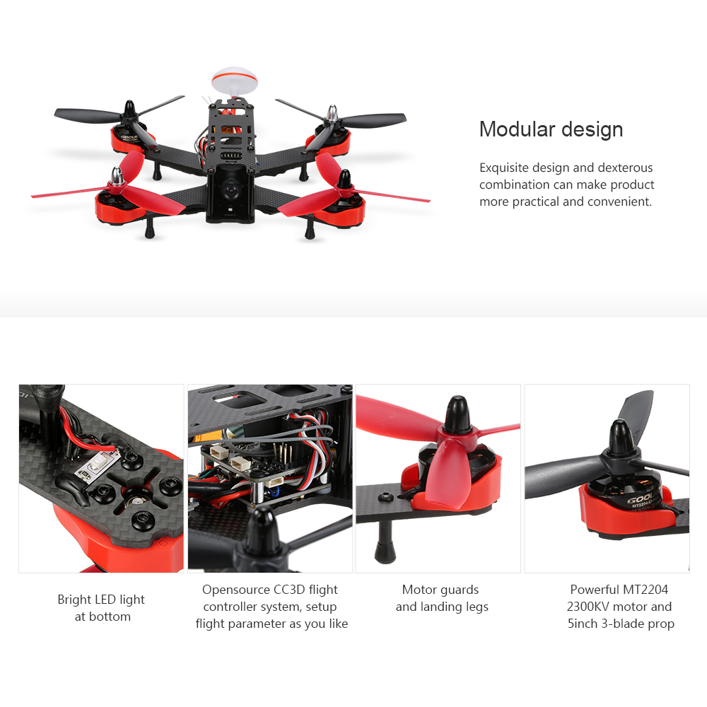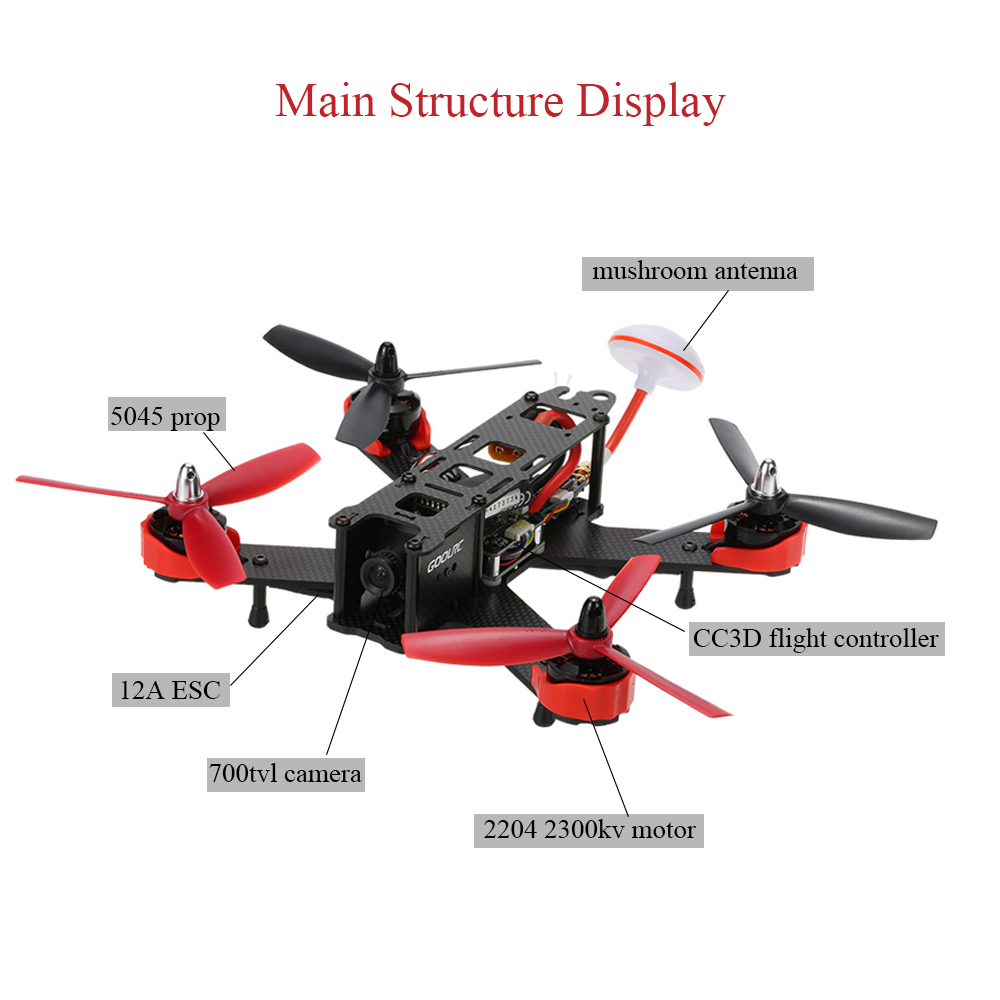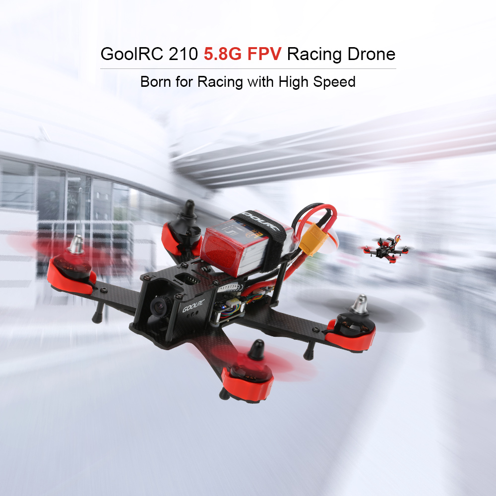 GoolRC 210 5.8G FPV racing drone, fantastic racing quad that performs as great as it looks. The power comes from four powerful 2204 2300KV motors driven by 12A ESC and 5045 prop. All this is controlled by opensource CC3D flight controller. And there is a 3mm carbon fiber board with XT60 connector for the battery. If you want to cross the finish line in first place you will need a winner of a racing quadcopter and the GoolRC 210 is the best choice. Besides it equipped with 700tvl camera, 5.8G transmitter and mushroom antenna. Only need a remote controller, FPV Goggles or a FPV monitor with AV receiver, then you can experience thrilling FPV racing.