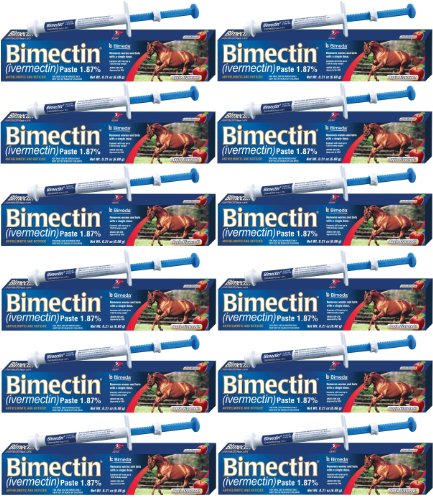 Studio : Bimeda Publisher : Bimeda Binding : Misc. Product Description 12 TUBES. 1.87 Ivermectin. Anthelmintic and boticide. Controls large and small strongyles, pinworms, ascarids, hairworms, large mouth stomach worms, lungworms, intestinal threadworms and bots. Proven safe for pregnant mares, breeding stallions and foals. Each syringe treats up to a 1250 lb. horse. Syringes are marked in 250 lb. increments. 0