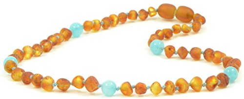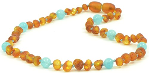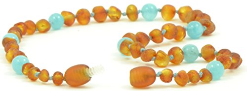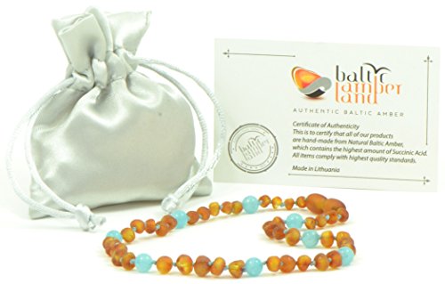 Raw Amber Necklaces for Baby made with Aquamarine Beads - 12.6 Inches (32 cm) - Baltic Amber Land - Raw Cognac Amber Beads - Knotted - Screw...