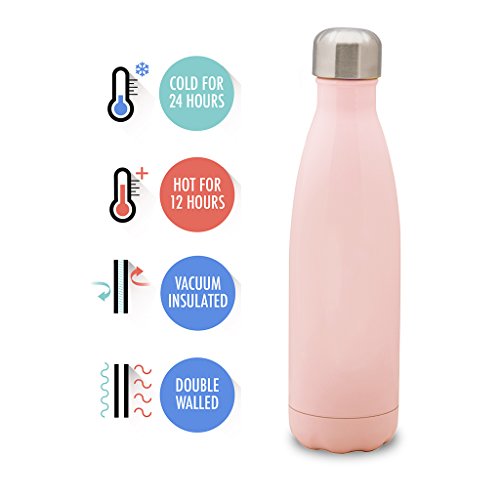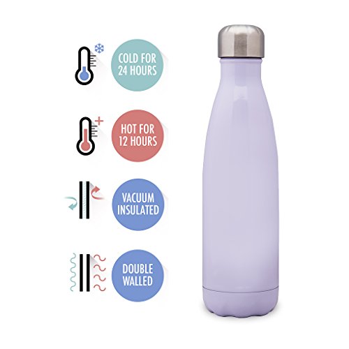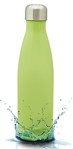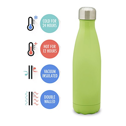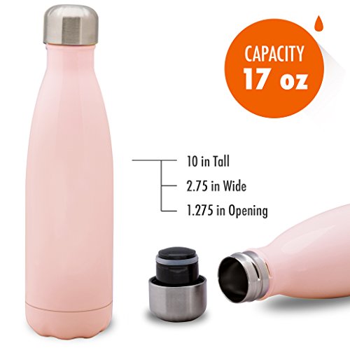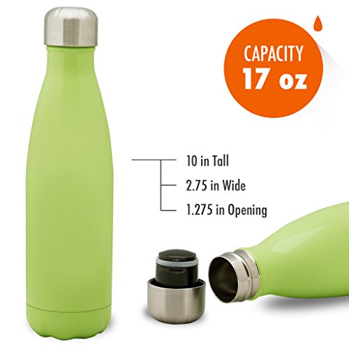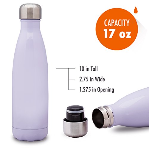 [Description] Sturdy_ Durable Quality: This sleek and rugged sports water bottle is made from high quality food grade 18/8 stainless steel that will not break. It is crafted and designed to last and should not rust. Better than using plastic or glass water bottles! Perfect Size: 17 oz (500 ml) capacity is large enough to fit your daily hydration needs. You can also store milk or coffee. The stainless steel repels any lingering flavors. Put your portable sports water bottle in your gym bag_ backpack or briefcase as your daily companion. Can also fit in most auto cup holders. No Leaking: The travel water bottle comes with a leak proof_ insulated_ BPA and Phthalates free cap. The stainless steel lid will prevent any accidental spills. This multifunctional water bottle is easy to grab_ while you are on the go. Easy Flow: The open mouth allows the water to stream out while on the go to help you stay hydrated. The double walled vacuum insulated water bottle allows for easy filling and cleaning. Even when filled with ice_ the bottle will not sweat. No coaster needed! Daily Lifestyle: Take this easy to carry portable water bottle while hiking_ biking_ shopping or leave it at the office. While sitting anywhere in any temperature condition_ your cold drink will stay perfectly chilled up to 24 hours or your coffee_ tea or hot drink will keep hot for up to 12 hours. The insulated water bottle is a great gift for any occasion for family or friends.