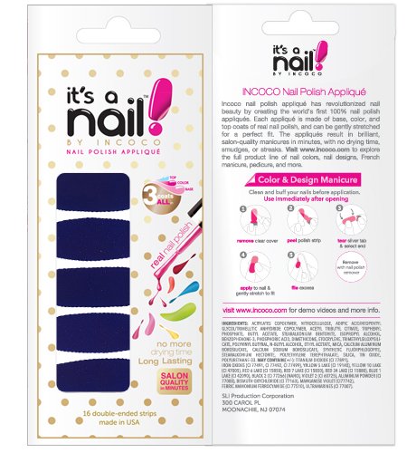 -. Binding : Misc. -. Brand : It's a Nail -. EAN : 0715201075398 -. Feature : THE PERFECT MANICURE IN MINUTES! / Incoco has revolutionized nail beauty by creating the world's first 100% real nail polish appliques! / Each applique is made of a base, color and top coat of real nail polish. These appliques are flexible and can be gently / stretched to easily fit any nail size and shape. The result is a brilliant, salon-quality manicure in minutes with no dry time, smudges or streaks. -. Label : Incoco -. Manufacturer : Incoco -. MPN : 3170472 -. PackageQuantity : 1 -. PartNumber : 3170472 -. ProductGroup : Health and Beauty -. ProductTypeName : HEALTH_PERSONAL_CARE -. Publisher : Incoco -. Studio : Incoco -. Title : Authentic Incoco Nail Polish 16 Double-ended Strips By It's a Nail - Navy -. UPC : 715201075398