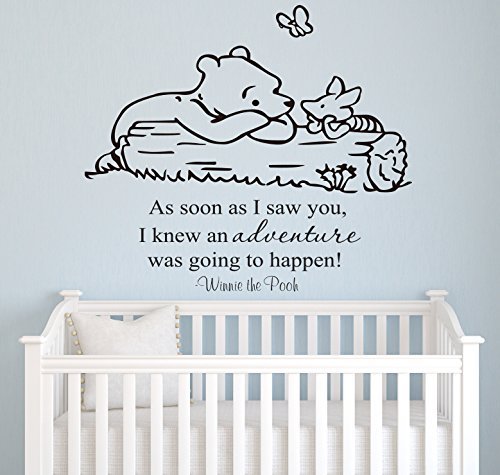 -. Binding : Baby Product -. Brand : WildBear -. Color : Beige -. Feature : Vinyl Sticker Winnie The Pooh & Piglet As Soon As I Saw You Quote Wall Decal / Apply easily on any flat surface / Remove easily without leaving scratches into the wall / Other sizes also available, ask for it / Other colors also available, see chart above -. IsAdultProduct : 0 -. Label : WildBear -. Manufacturer : WildBear -. ProductGroup : Baby Product -. ProductTypeName : BABY_PRODUCT -. Publisher : WildBear -. Studio : WildBear -. Title : Winnie Pooh - As Soon As I Saw You Quote Baby Room Wall Decal- Decal For Baby's Room- Quote Mural Decal