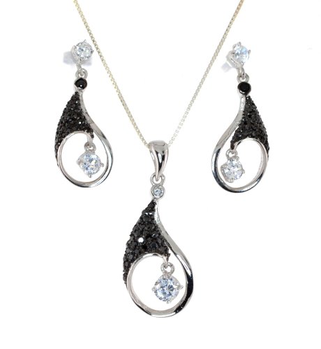 -. Binding : Jewelry -. Brand : Heartbeats -. Department : womens -. Feature : Pendent:24mm Length x 12mm Width Earrings:22mmLength x 12mm Width / Sterling Silver Simulated Cubic Zirconia Pendent earring set / Sterling Silver 16 inches long Box Chain +2 inch extension with SP.R.Ing ring clasp / Friction Post Back Earring for pierced ears / Suede Jewelry Gift Box Included -. ProductGroup : Jewelry -. ProductTypeName : FASHIONOTHER -. Title : Sterling Silver Black and White Simulated Diamond Drop Necklace Earring Set