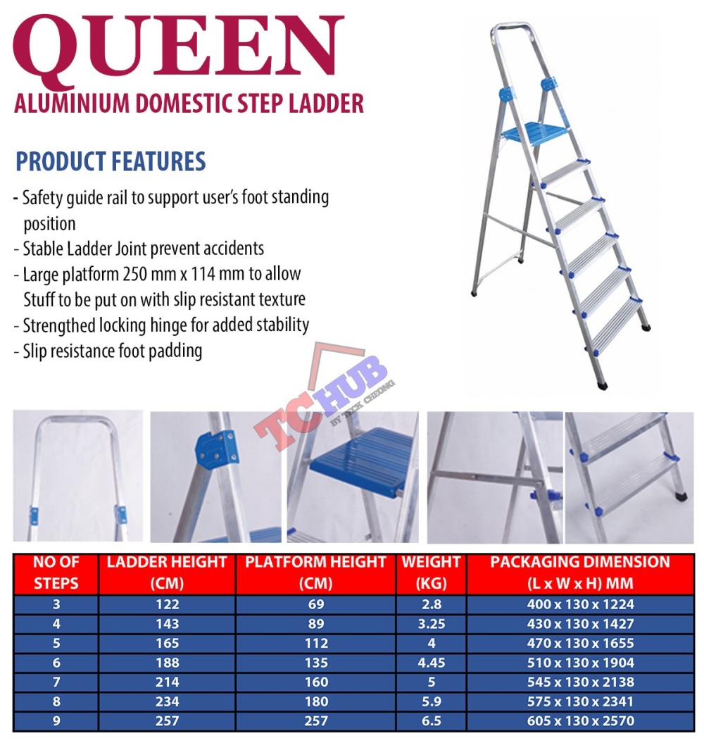 Safety guide rail to support user's foot standing positionStable ladder joint prevent accidentsLarge platform 250 mm x 114 mm to allow stuff to be placedPlatform with slip-resistant textureStrengthened locking hinge for added stabilitySlip resistance foot padding
