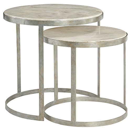 -. Brand : Kathy Kuo Home -. Color : Silver -. Feature : Large: 24 inches high x 24.25 inches wide x 24.25 inches deep; Small: 19.75 inches high x 20.25 inches wide x 20.25 inches deep / Constructed from marble and solid steel / Rustic, matte silver finish and natural ivory stone top / Weight: 98 pounds; Sold as a set of 2 / Please allow 6 weeks for production -. Label : Kathy Kuo Home -. Manufacturer : Kathy Kuo Home -. MPN : BER-IN-362-031 -. PartNumber : BER-IN-362-031 -. ProductGroup : Furniture -. ProductTypeName : HOME_FURNITURE_AND_DECOR -. Publisher : Kathy Kuo Home -. Studio : Kathy Kuo Home -. Title : Kendri Regency Round Matte Silver Marble Nesting Tables - Pair